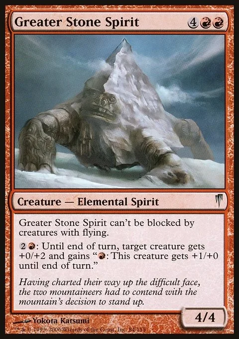 Greater Stone Spirit can't be blocked by creatures with flying. {2}{R}: Until end of turn, target creature gets +0/+2 and gains "{R}: This creature gets +1/+0 until end of turn."