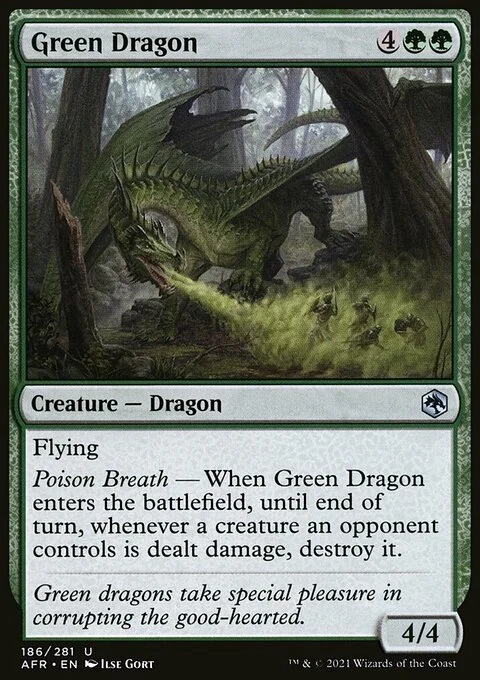 Flying Poison Breath — When Green Dragon enters the battlefield, until end of turn, whenever a creature an opponent controls is dealt damage, destroy it.