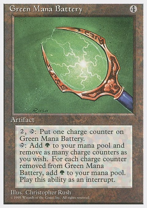 2, T: Put one charge counter on Green Mana Battery.T: Add G to your mana pool and remove as many charge counters as you wish. For each charge counter removed from Green Mana Battery, add G to your mana pool. Play this ability as an interrupt.