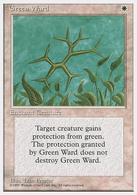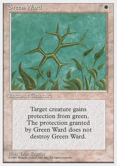 Target creature gains protection from green. The protection granted by Green Ward does not destroy Green Ward.