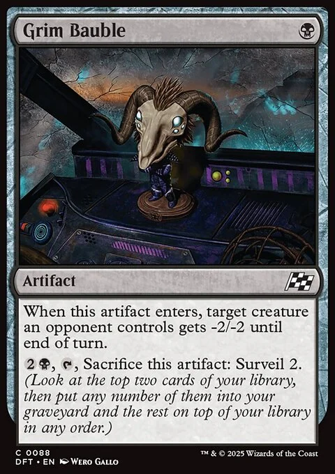 {2}{B}, {T}, Sacrifice this artifact: Surveil 2. (Look at the top two cards of your library, then put any number of them into your graveyard and the rest on top of your library in any order.)