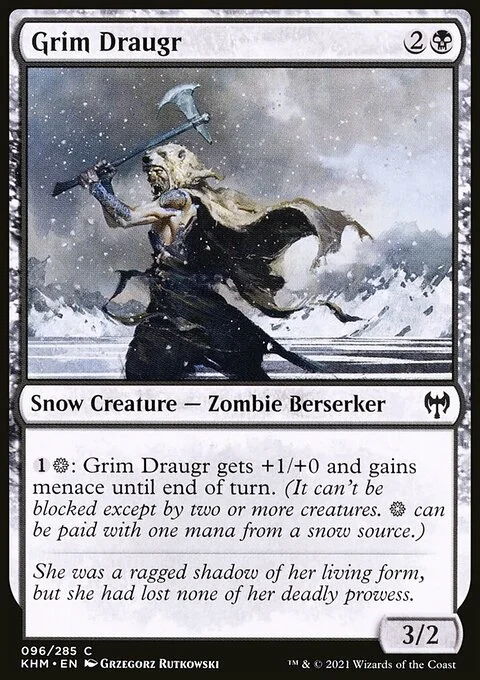{1}{S}: Grim Draugr gets +1/+0 and gains menace until end of turn. (It can't be blocked except by two or more creatures. {S} can be paid with one mana from a snow source.)