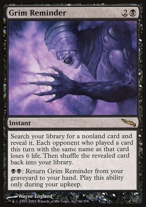 Search your library for a nonland card and reveal it. Each opponent who cast a spell this turn with the same name as that card loses 6 life. Then shuffle. {B}{B}: Return Grim Reminder from your graveyard to your hand. Activate only during your upkeep.