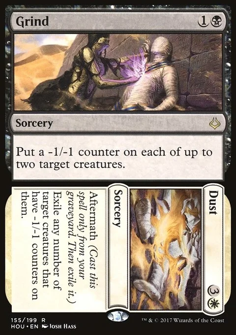 Grind Put a -1/-1 counter on each of up to two target creatures. Dust Aftermath (Cast this spell only from your graveyard. Then exile it.) Exile any number of target creatures that have -1/-1 counters on them.