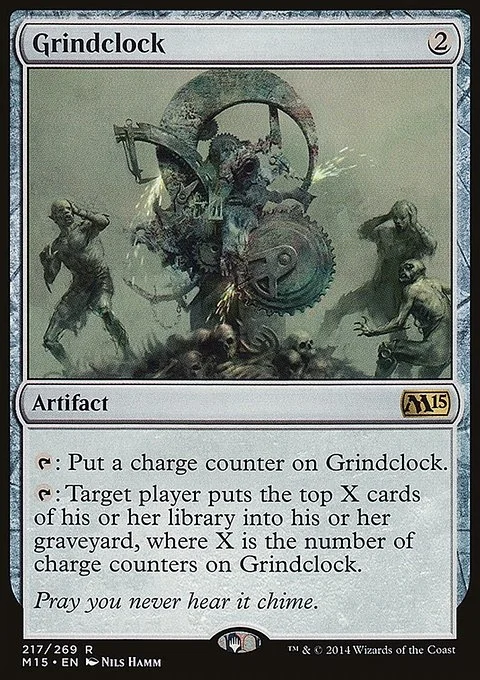 T: Target player puts the top X cards of his or her library into his or her graveyard, where X is the number of charge counters on Grindclock.