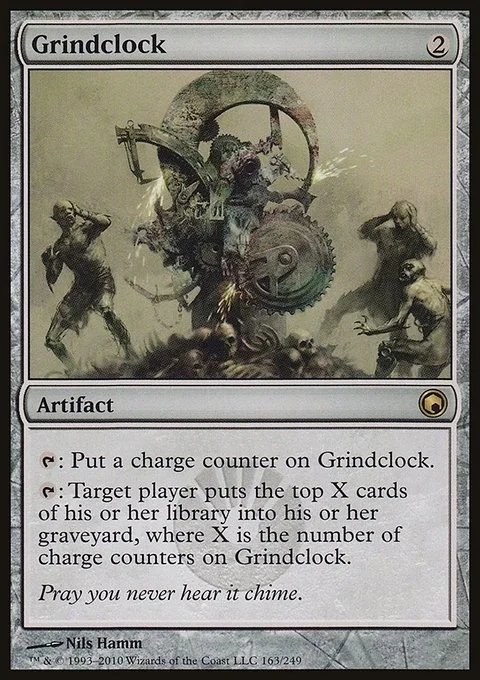{T}: Put a charge counter on Grindclock. {T}: Target player puts the top X cards of their library into their graveyard, where X is the number of charge counters on Grindclock.