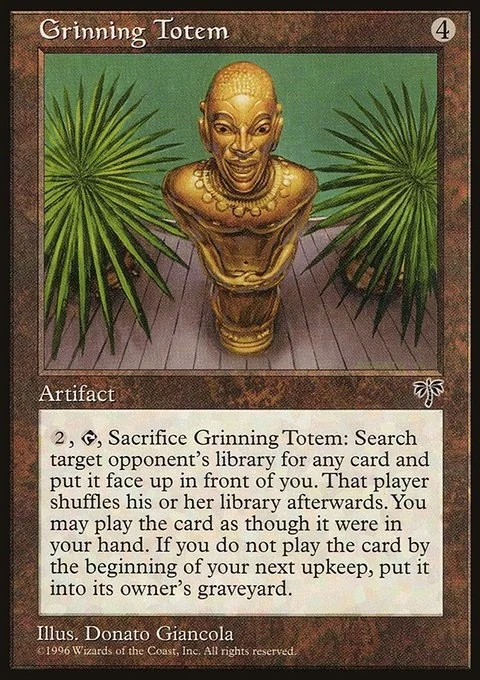 2, tap, Sacrifice Grinning Totem: Search target opponent’s library for any card and put it face up in front of you. That player shuffles his or her library afterwards. You may play the card as though it were in your hand. If you do not play the card by the beginning of your next upkeep, put it into its owner’s graveyard.