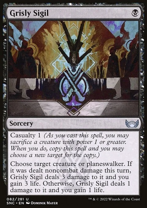 Choose target creature or planeswalker. If it was dealt noncombat damage this turn, Grisly Sigil deals 3 damage to it and you gain 3 life. Otherwise, Grisly Sigil deals 1 damage to it and you gain 1 life.
