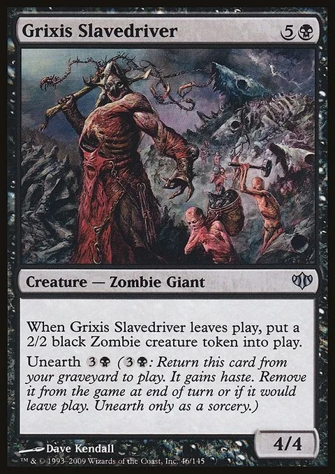 When Grixis Slavedriver leaves the battlefield, create a 2/2 black Zombie creature token. Unearth {3}{B} ({3}{B}: Return this card from your graveyard to the battlefield. It gains haste. Exile it at the beginning of the next end step or if it would leave the battlefield. Unearth only as a sorcery.)