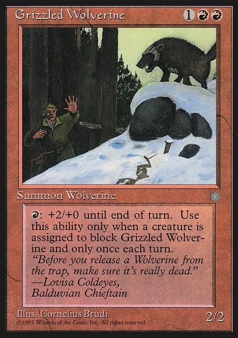 {R}: Grizzled Wolverine gets +2/+0 until end of turn. Activate only during the declare blockers step, only if at least one creature is blocking Grizzled Wolverine, and only once each turn.