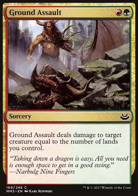 Ground Assault deals damage to target creature equal to the number of lands you control.
