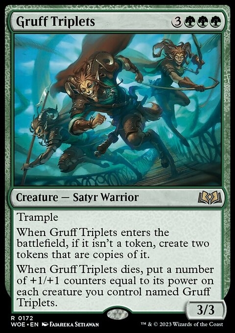 Trample When Gruff Triplets enters, if it isn't a token, create two tokens that are copies of it. When Gruff Triplets dies, put a number of +1/+1 counters equal to its power on each creature you control named Gruff Triplets.