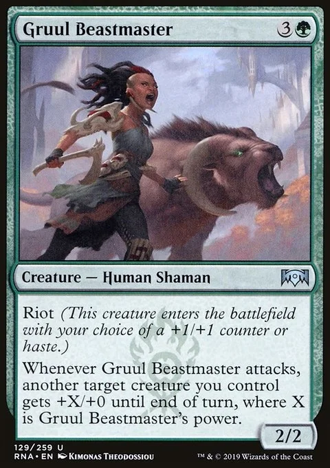 Riot (This creature enters the battlefield with your choice of a +1/+1 counter or haste.) Whenever Gruul Beastmaster attacks, another target creature you control gets +X/+0 until end of turn, where X is Gruul Beastmaster's power.