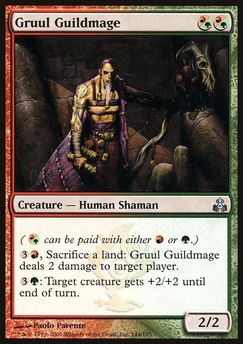 ({R/G} can be paid with either {R} or {G}.) {3}{R}, Sacrifice a land: Gruul Guildmage deals 2 damage to target player or planeswalker. {3}{G}: Target creature gets +2/+2 until end of turn.