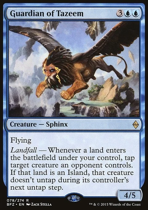 Flying Landfall — Whenever a land enters the battlefield under your control, tap target creature an opponent controls. If that land is an Island, that creature doesn't untap during its controller's next untap step.