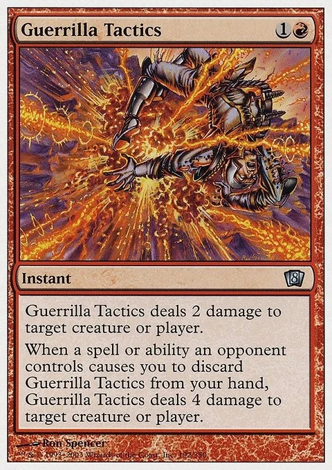 Guerrilla Tactics deals 2 damage to any target. When a spell or ability an opponent controls causes you to discard Guerrilla Tactics, Guerrilla Tactics deals 4 damage to any target.