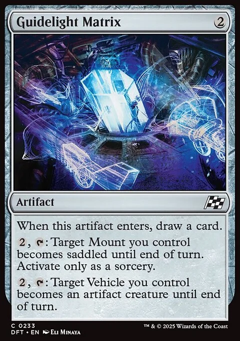 When this artifact enters, draw a card. {2}, {T}: Target Mount you control becomes saddled until end of turn. Activate only as a sorcery. {2}, {T}: Target Vehicle you control becomes an artifact creature until end of turn.