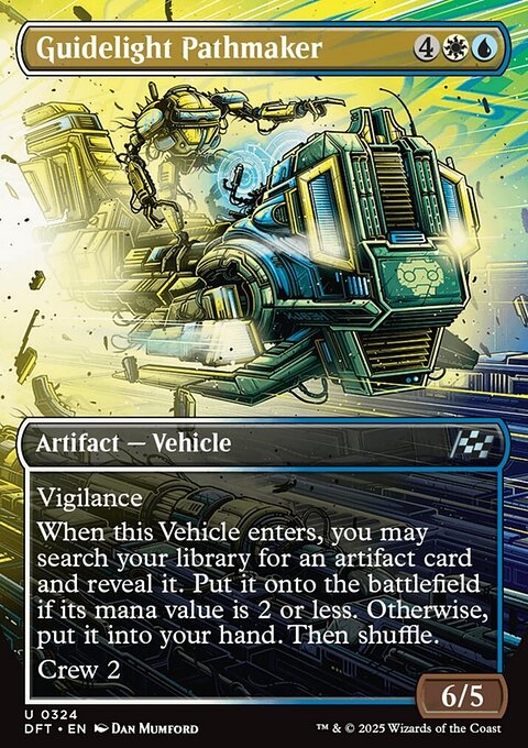 Vigilance When this Vehicle enters, you may search your library for an artifact card and reveal it. Put it onto the battlefield if its mana value is 2 or less. Otherwise, put it into your hand. If you search your library this way, shuffle. Crew 2