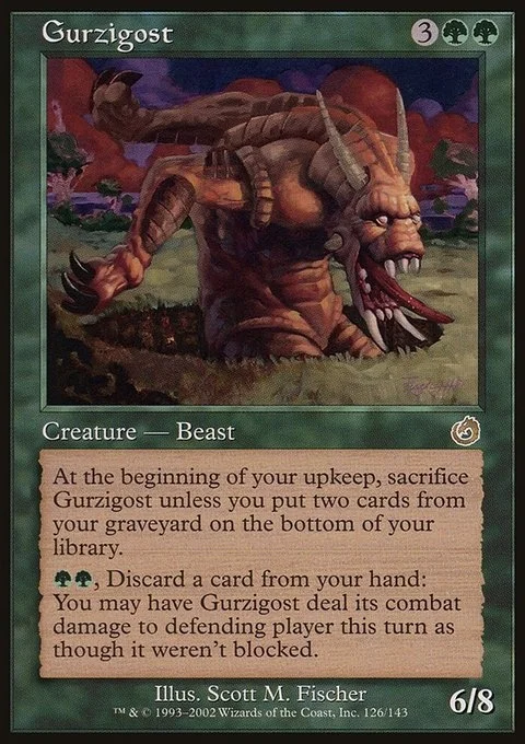 At the beginning of your upkeep, sacrifice Gurzigost unless you put two cards from your graveyard on the bottom of your library. {G}{G}, Discard a card: You may have Gurzigost assign its combat damage this turn as though it weren't blocked.