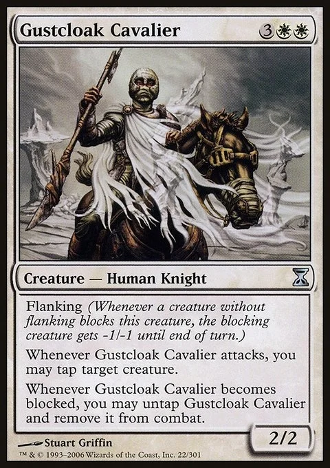 Whenever Gustcloak Cavalier becomes blocked, you may untap Gustcloak Cavalier and remove it from combat.