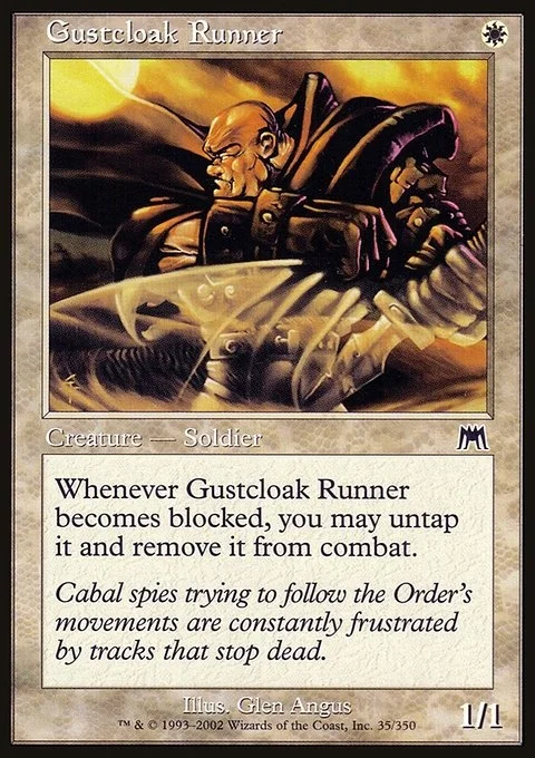 Whenever Gustcloak Runner becomes blocked, you may untap it and remove it from combat.