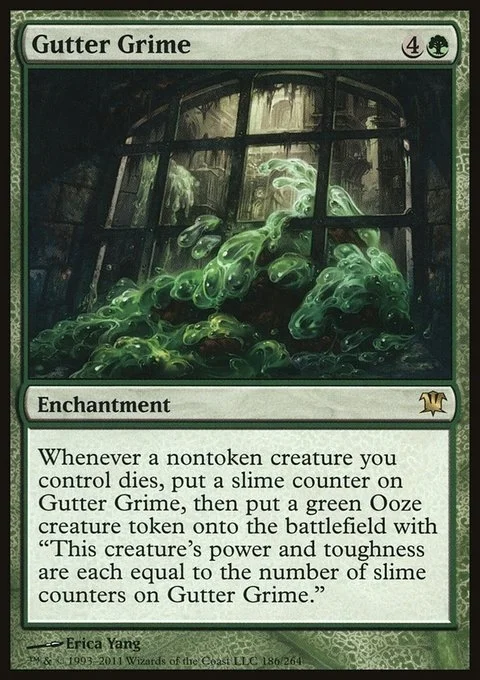 Whenever a nontoken creature you control dies, put a slime counter on Gutter Grime, then create a green Ooze creature token with "This creature's power and toughness are each equal to the number of slime counters on Gutter Grime."