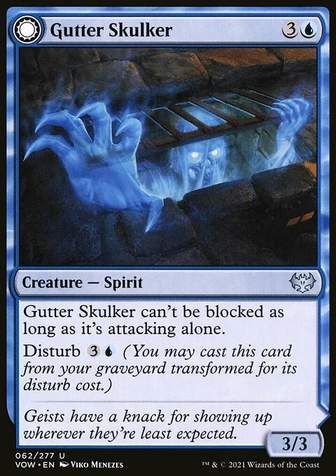 Gutter Skulker Gutter Skulker can't be blocked as long as it's attacking alone. Disturb {3}{U} (You may cast this card from your graveyard transformed for its disturb cost.) Gutter Shortcut Enchant creature Enchanted creature can't be blocked as long as it's attacking alone. If Gutter Shortcut would be put into a graveyard from anywhere, exile it instead.
