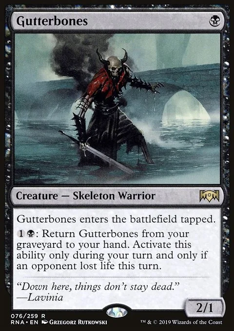 Gutterbones enters the battlefield tapped. {1}{B}: Return Gutterbones from your graveyard to your hand. Activate only during your turn and only if an opponent lost life this turn.