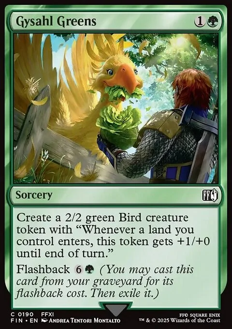 Create a 2/2 green Bird creature token with "Whenever a land you control enters, this token gets +1/+0 until end of turn." Flashback {6}{G} (You may cast this card from your graveyard for its flashback cost. Then exile it.)