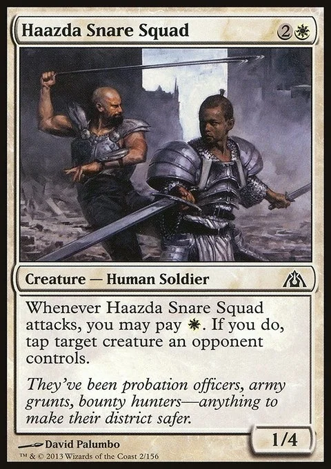 Whenever Haazda Snare Squad attacks, you may pay {W}. If you do, tap target creature an opponent controls.