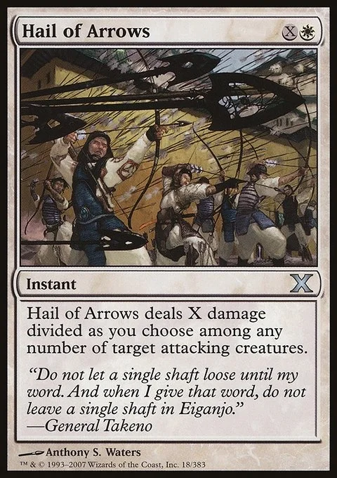 Hail of Arrows deals X damage divided as you choose among any number of target attacking creatures.