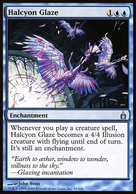 Whenever you cast a creature spell, Halcyon Glaze becomes a 4/4 Illusion creature with flying in addition to its other types until end of turn.