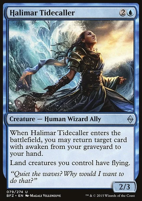 When Halimar Tidecaller enters the battlefield, you may return target card with awaken from your graveyard to your hand. Land creatures you control have flying.