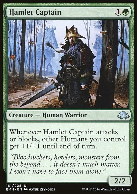 Whenever Hamlet Captain attacks or blocks, other Humans you control get +1/+1 until end of turn.