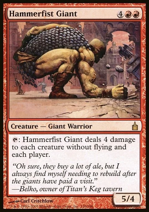 {T}: Hammerfist Giant deals 4 damage to each creature without flying and each player.