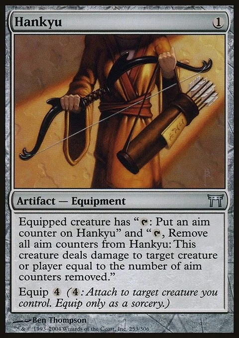 Equipped creature has "{T}: Put an aim counter on Hankyu" and "{T}, Remove all aim counters from Hankyu: This creature deals damage to any target equal to the number of aim counters removed this way." Equip {4} ({4}: Attach to target creature you control. Equip only as a sorcery.)