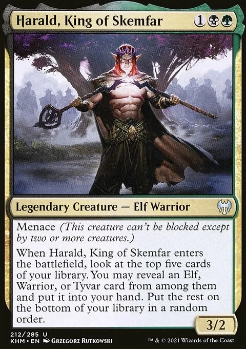 When Harald, King of Skemfar enters the battlefield, look at the top five cards of your library. You may reveal an Elf, Warrior, or Tyvar card from among them and put it into your hand. Put the rest on the bottom of your library in a random order.