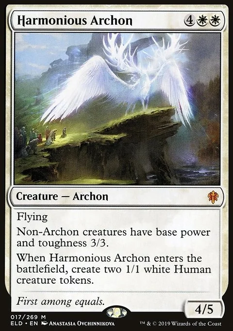 Flying Non-Archon creatures have base power and toughness 3/3. When Harmonious Archon enters the battlefield, create two 1/1 white Human creature tokens.