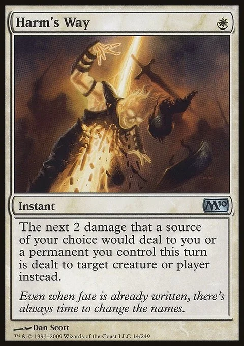 The next 2 damage that a source of your choice would deal to you and/or permanents you control this turn is dealt to any target instead.