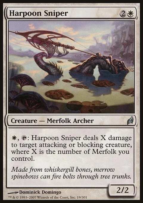 {W}, {T}: Harpoon Sniper deals X damage to target attacking or blocking creature, where X is the number of Merfolk you control.