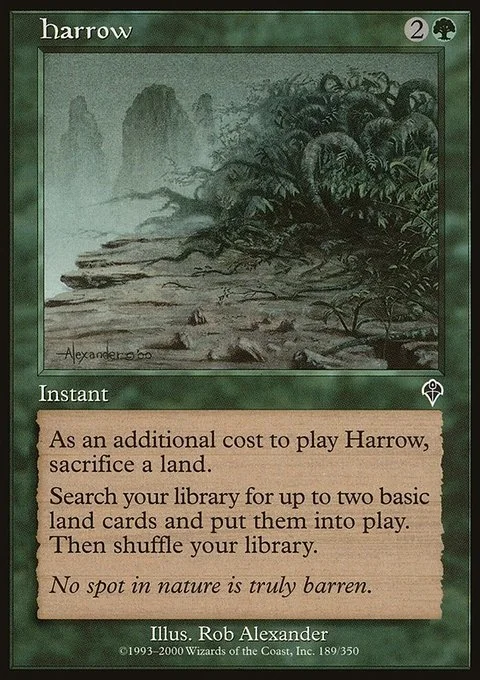 As an additional cost to cast this spell, sacrifice a land. Search your library for up to two basic land cards, put them onto the battlefield, then shuffle.