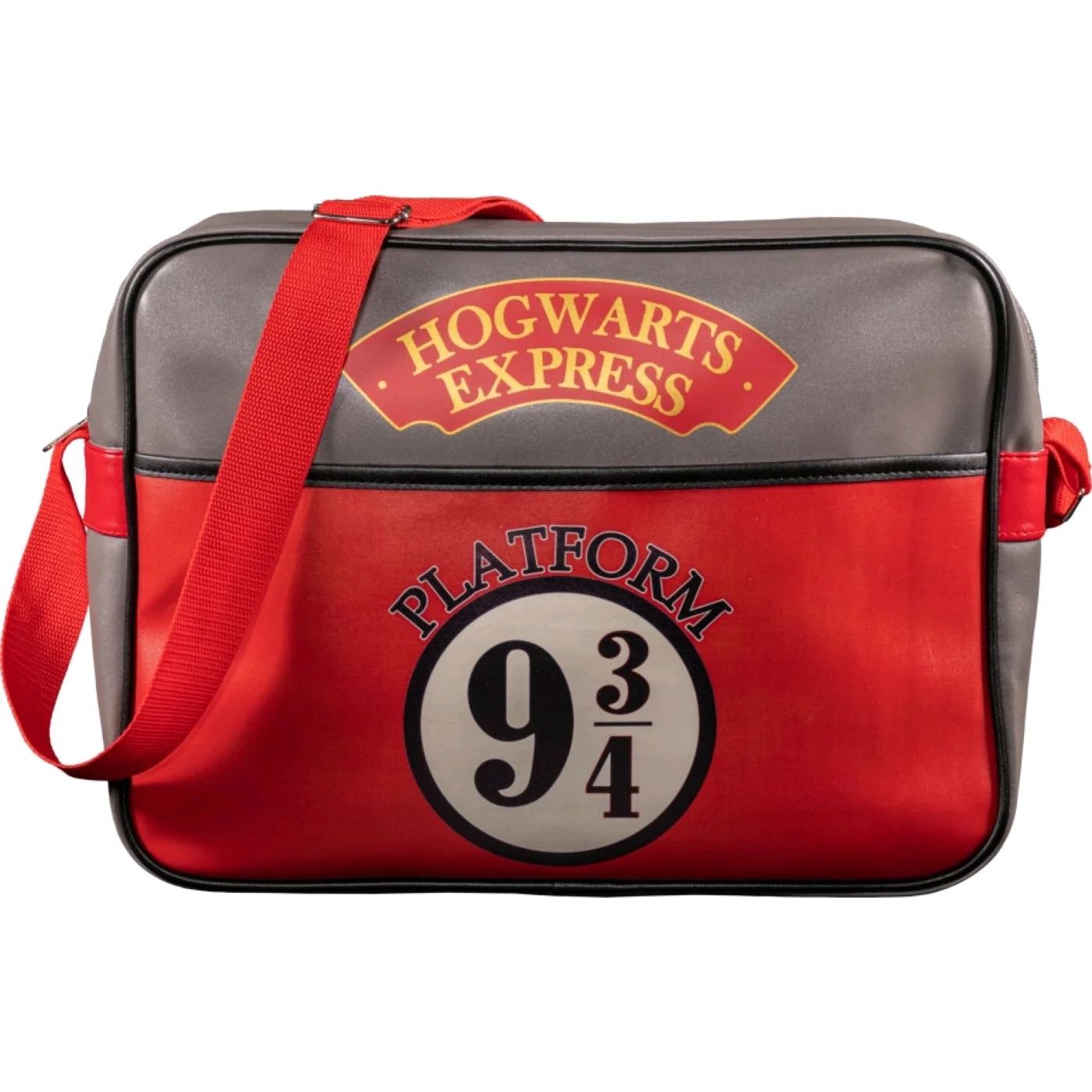 The stylish bag features a red and grey design with the Hogwarts Express and Platform 9 3/4 logo on the front, as well as an adjustable shoulder strap.