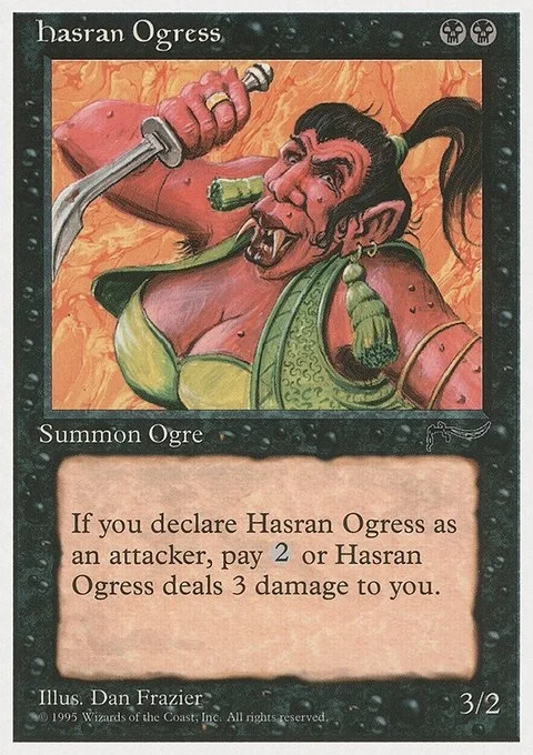 Whenever Hasran Ogress attacks, it deals 3 damage to you unless you pay {2}.