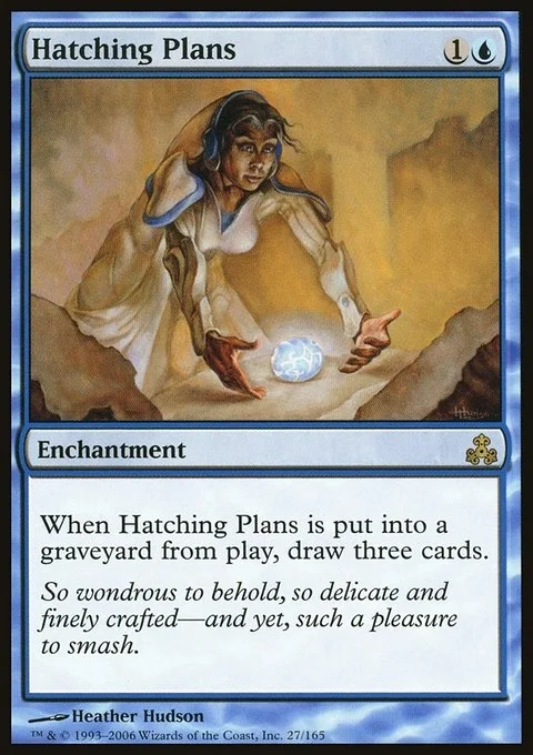 When Hatching Plans is put into a graveyard from the battlefield, draw three cards.