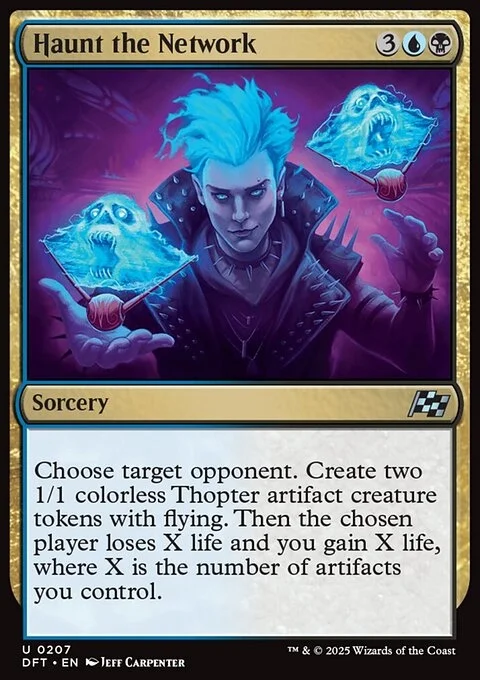 Choose target opponent. Create two 1/1 colorless Thopter artifact creature tokens with flying. Then the chosen player loses X life and you gain X life, where X is the number of artifacts you control.