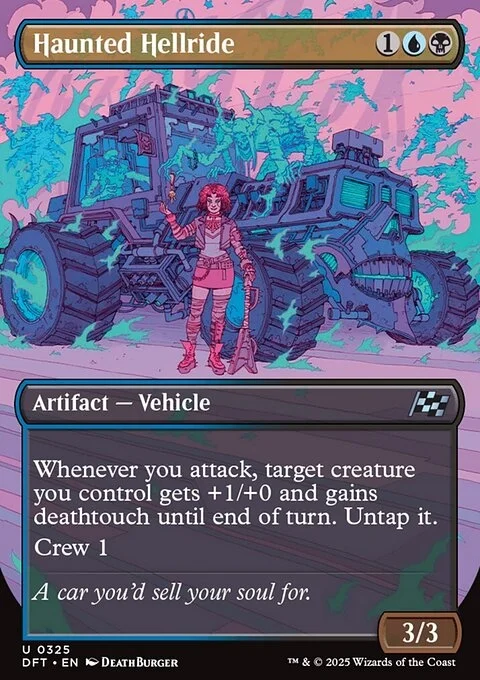 Whenever you attack, target creature you control gets +1/+0 and gains deathtouch until end of turn. Untap it. Crew 1 (Tap any number of creatures you control with total power 1 or more: This Vehicle becomes an artifact creature until end of turn.)
