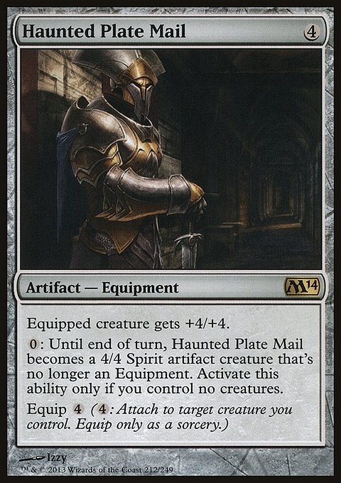 Equipped creature gets +4/+4. {0}: Until end of turn, Haunted Plate Mail becomes a 4/4 Spirit artifact creature that's no longer an Equipment. Activate this ability only if you control no creatures. Equip {4} ({4}: Attach to target creature you control. Equip only as a sorcery.)