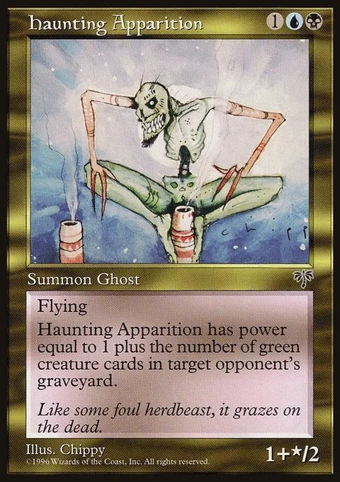 Haunting Apparition has power equal to 1 plus the number of green creature cards in target opponent’s graveyard.