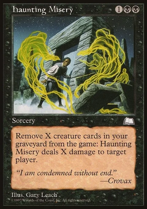 As an additional cost to cast this spell, exile X creature cards from your graveyard. Haunting Misery deals X damage to target player or planeswalker.