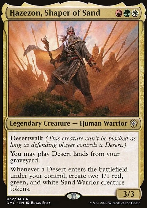 Desertwalk (This creature can't be blocked as long as defending player controls a Desert.) You may play Desert lands from your graveyard. Whenever a Desert you control enters, create two 1/1 red, green, and white Sand Warrior creature tokens.